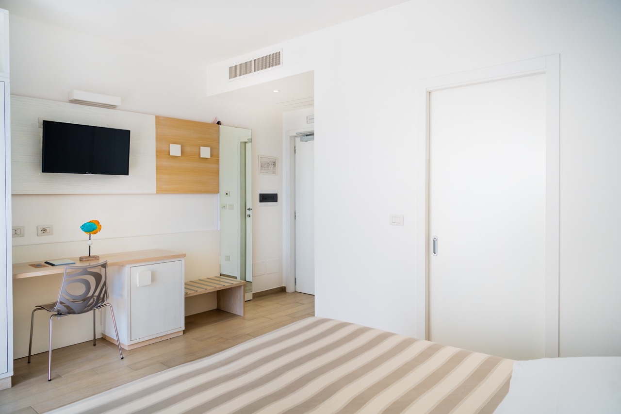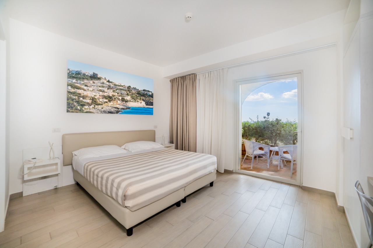 Si distingue dalla camera standard grazie al suo patio privato al piano terra, delimitato da siepi e caratterizzato da una vista mare parziale. Accuratamente attrezzato, rappresenta lo spazio ideale per momenti di relax da condividere con la propria famiglia.