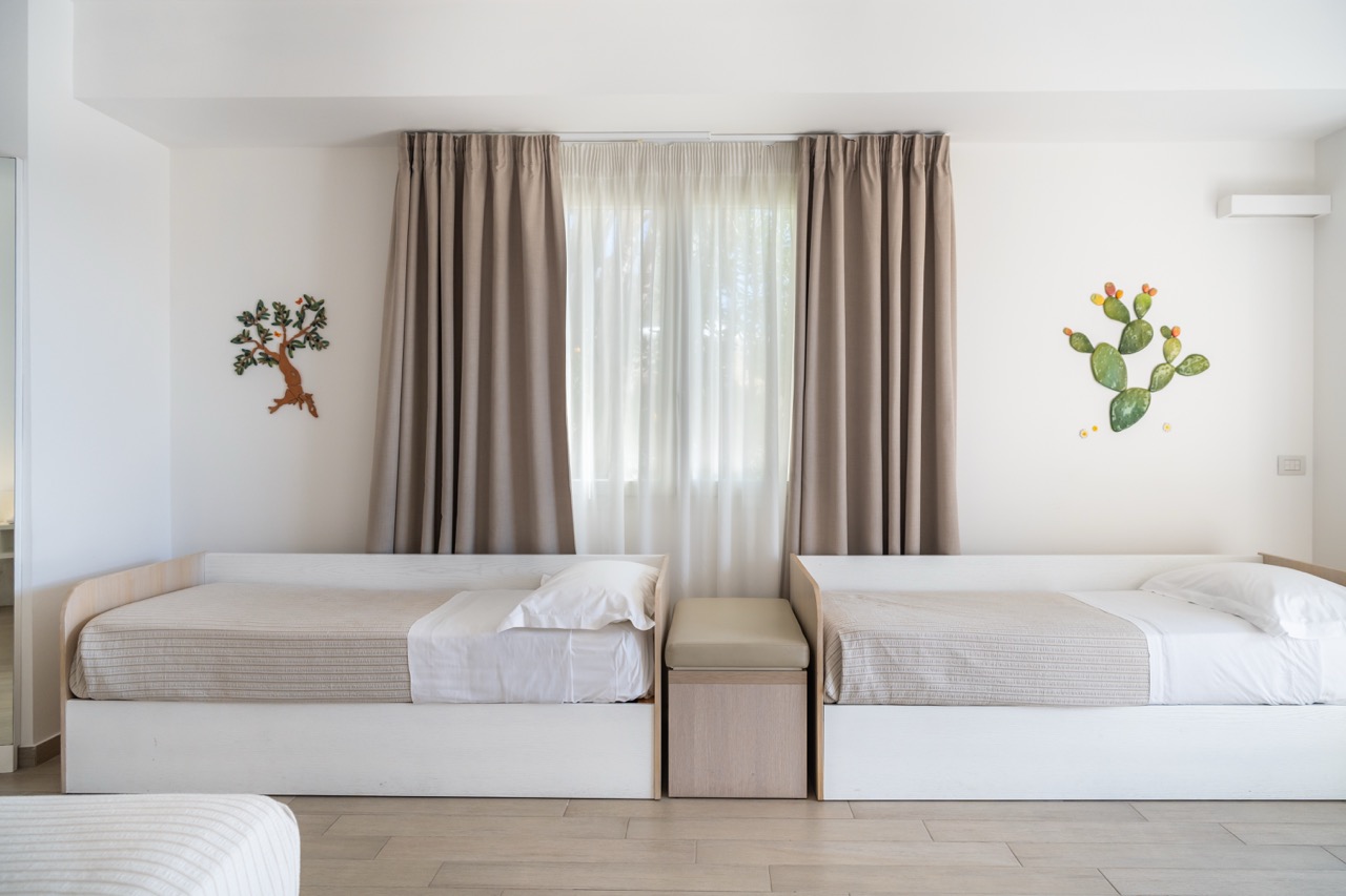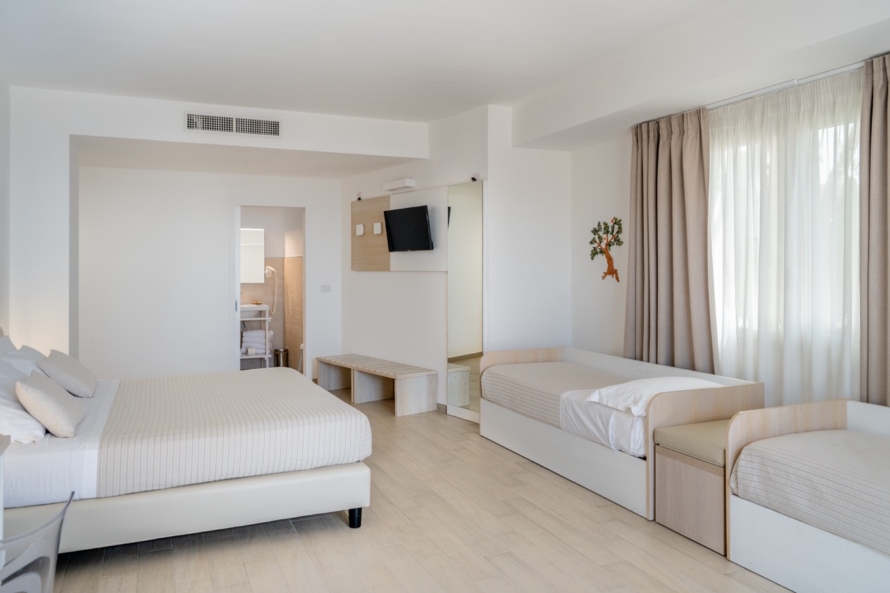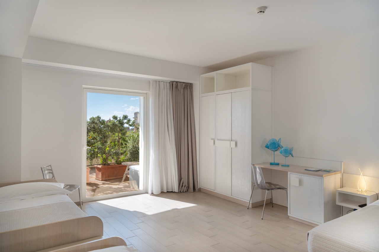 Si distingue dalla camera standard grazie al suo patio privato al piano terra, delimitato da siepi e caratterizzato da una vista mare parziale e attrezzato di salottino, rappresenta lo spazio ideale per momenti di relax da condividere con la propria famiglia.
