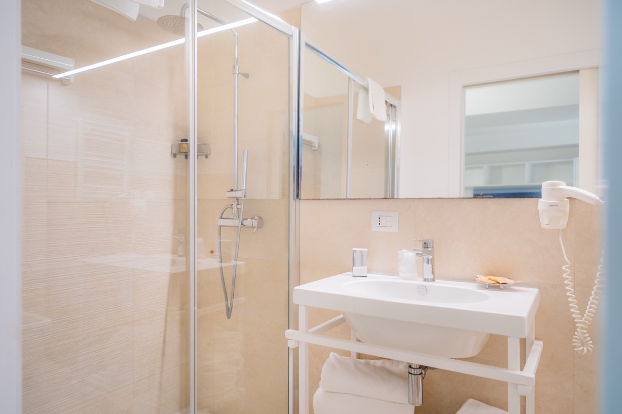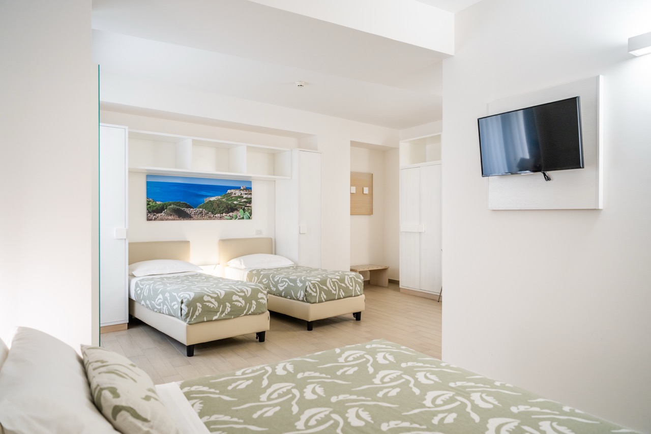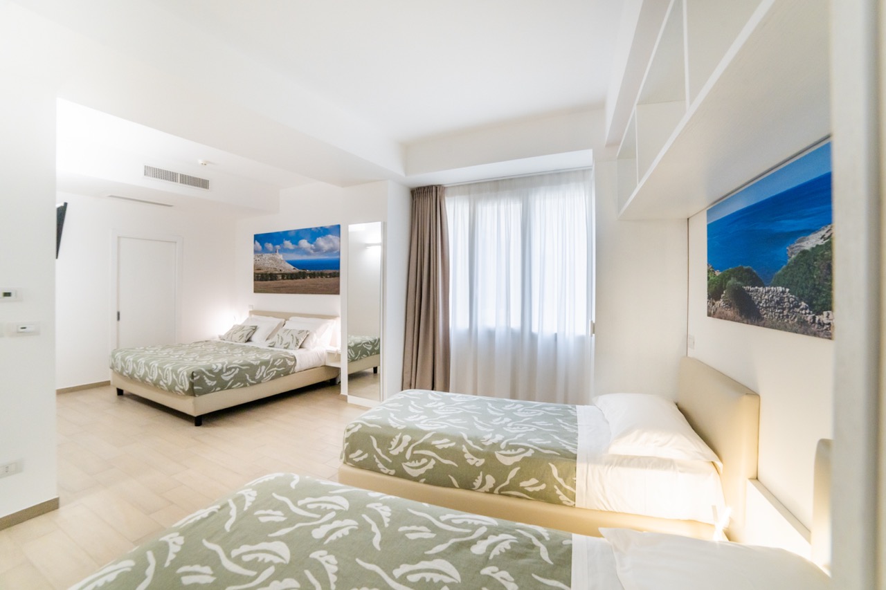 La camera quadrupla standard è dotata di una finestra con affaccio sul cortile interno dell’hotel. E’ spaziosa, luminosa e finemente arredata, rappresenta la soluzione perfetta per le famiglie che desiderano comfort e praticità. Può ospitare fino a 4 persone. Offre una flessibile configurazione dei posti letto: